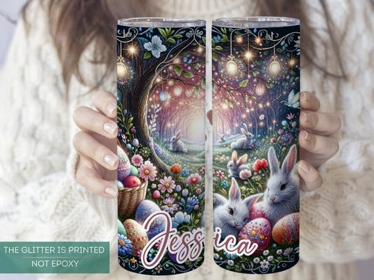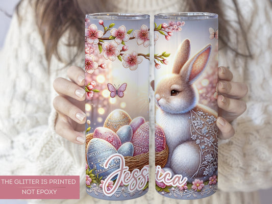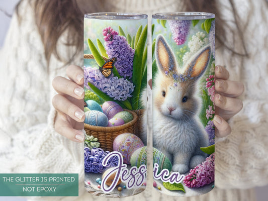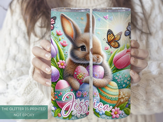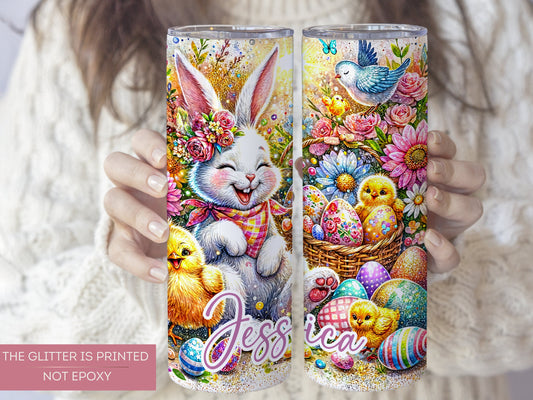 Personalized Glitter Easter Bunny Tumbler - Custom Floral Egg Design with Flowers and Chicks