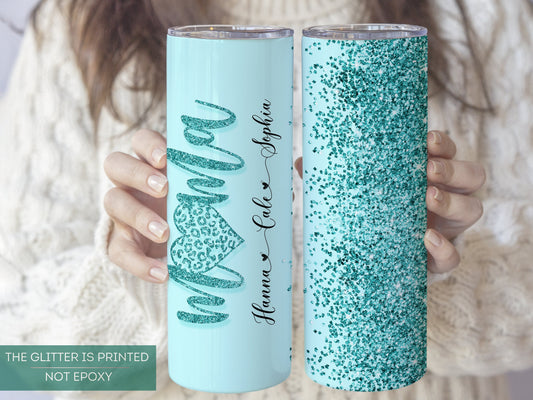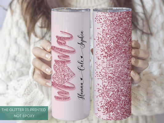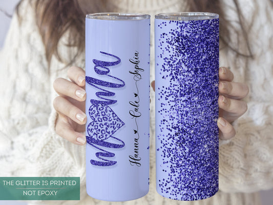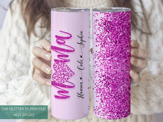 Personalized Mom Glitter Tumbler - Custom Mama Gift with Kids' Names for Mothers Day