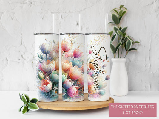Personalized Floral Tumbler with Glitter - Spring Tulip Design for Her or Mom