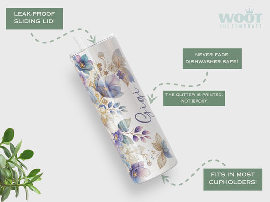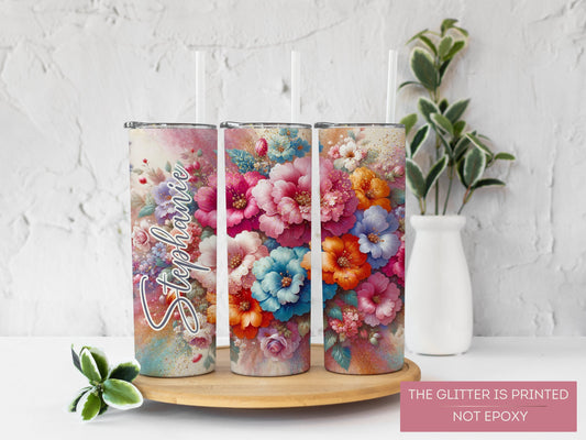 Personalized Spring Floral Tumbler - Glitter Flower Gift for Her or Mom
