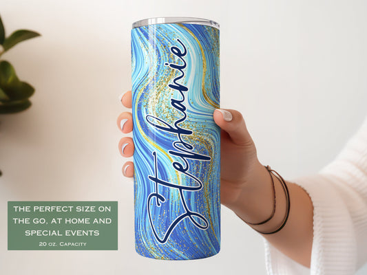 Personalized Blue Glitter Swirl Tumbler - Mothers Day or Bridesmaid Gift