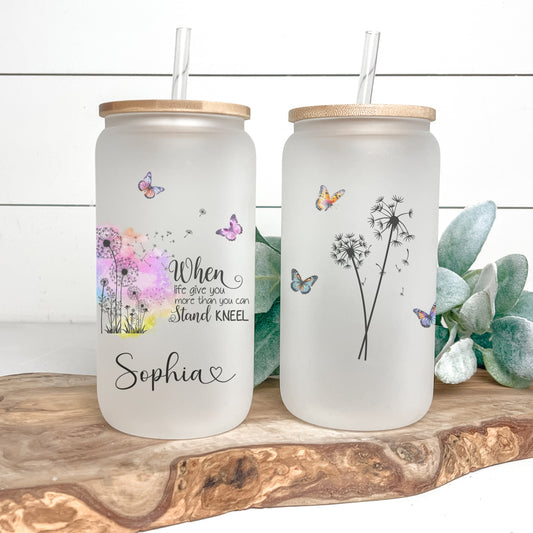 Personalized Butterfly Glass Tumbler - Custom Frosted Coffee Cup with Dandelion Design