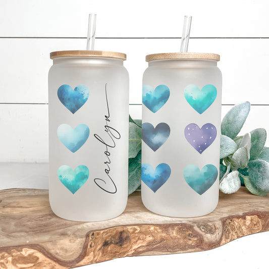 Personalized Blue Heart Glass Cup - Custom Frosted Tumbler for Iced Coffee Lovers