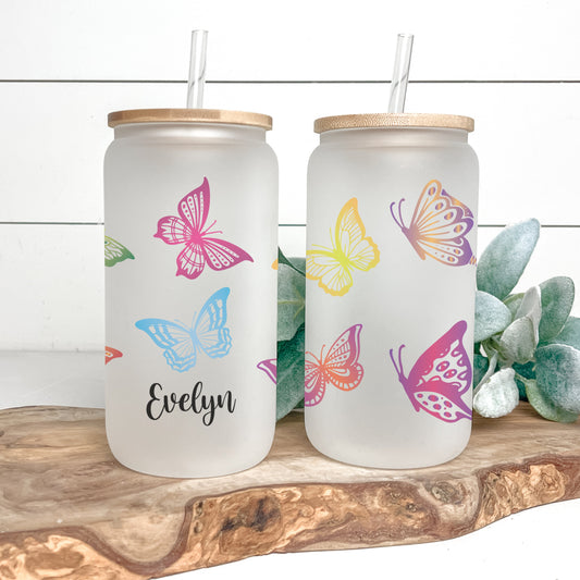 Personalized Butterfly Frosted Glass Cup - Custom Iced Coffee Tumbler for Butterfly Lovers