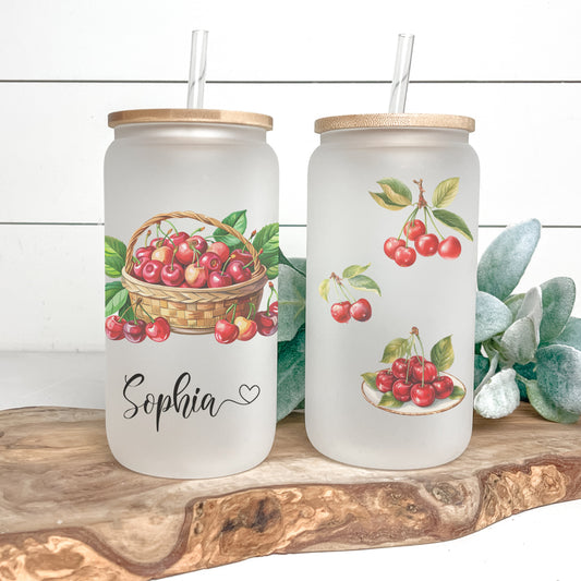 Personalized Cherry Glass Tumbler - Custom Frosted Cup for Iced Coffee Lovers