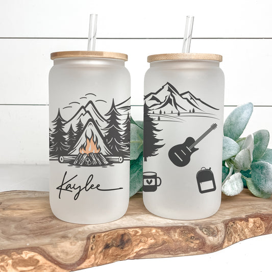 Personalized Camping Frosted Glass Tumbler - Custom Cup for Outdoor & Coffee Lovers
