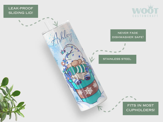 Personalized Christmas Gnome Tumbler - Snowflake Winter Gift for Her