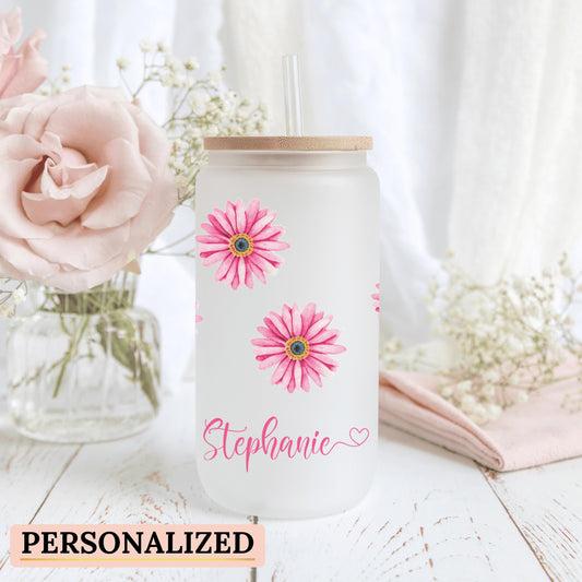 Personalized Daisy Glass Cup - Retro Floral Iced Coffee Tumbler