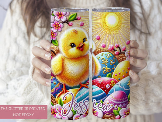 Personalized Easter Chicken Tumbler - Floral Embroidery & Spring Baby Chicks Design