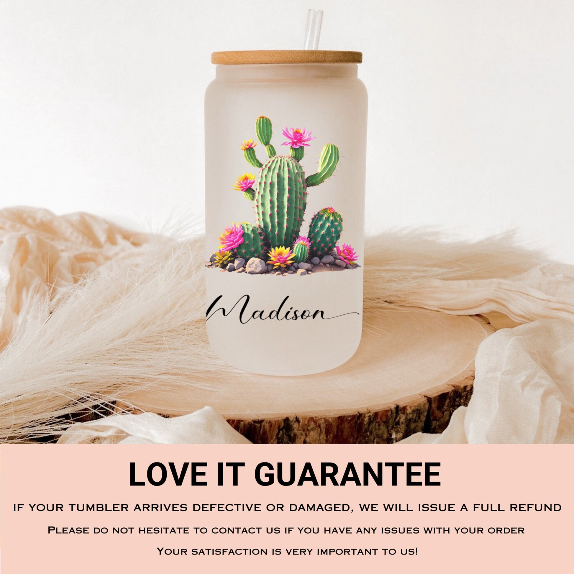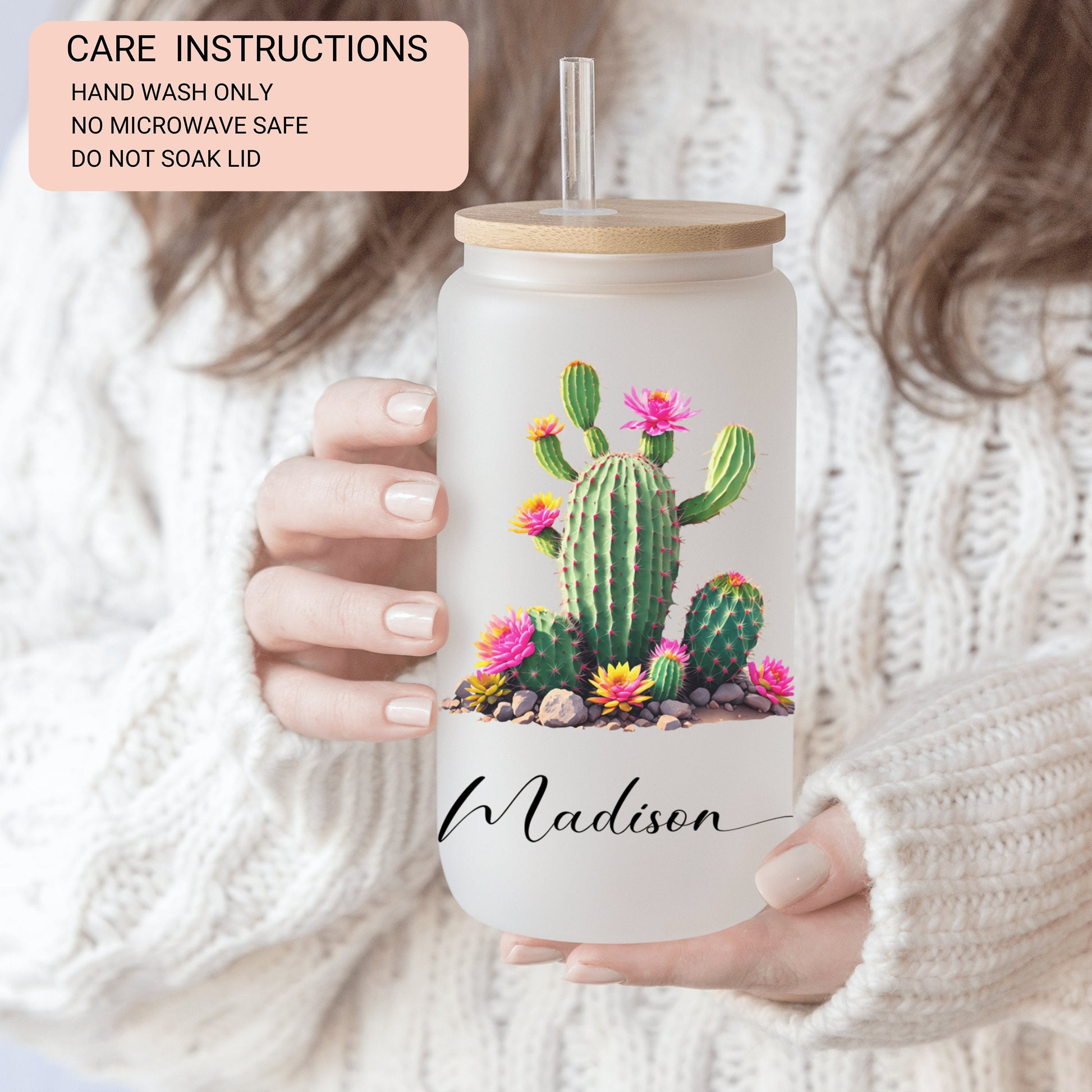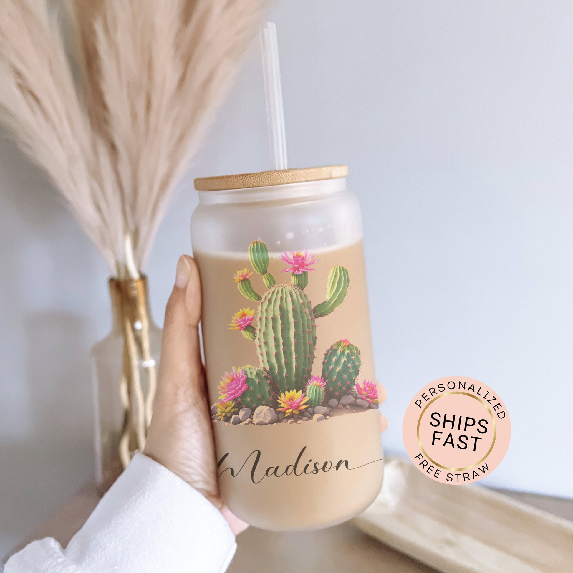Personalized Cactus Frosted Glass Cup - Custom Tumbler for Iced Coffee Lovers