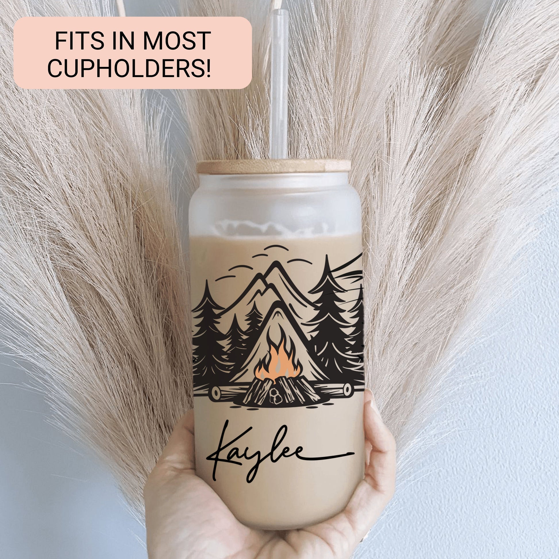 Personalized Camping Frosted Glass Tumbler - Custom Cup for Outdoor & Coffee Lovers