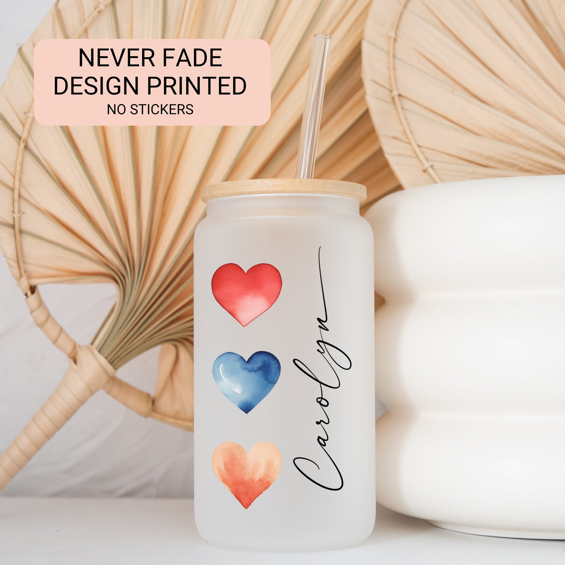 Personalized Watercolor Heart Tumbler - Frosted Glass Gift for Coffee Lovers
