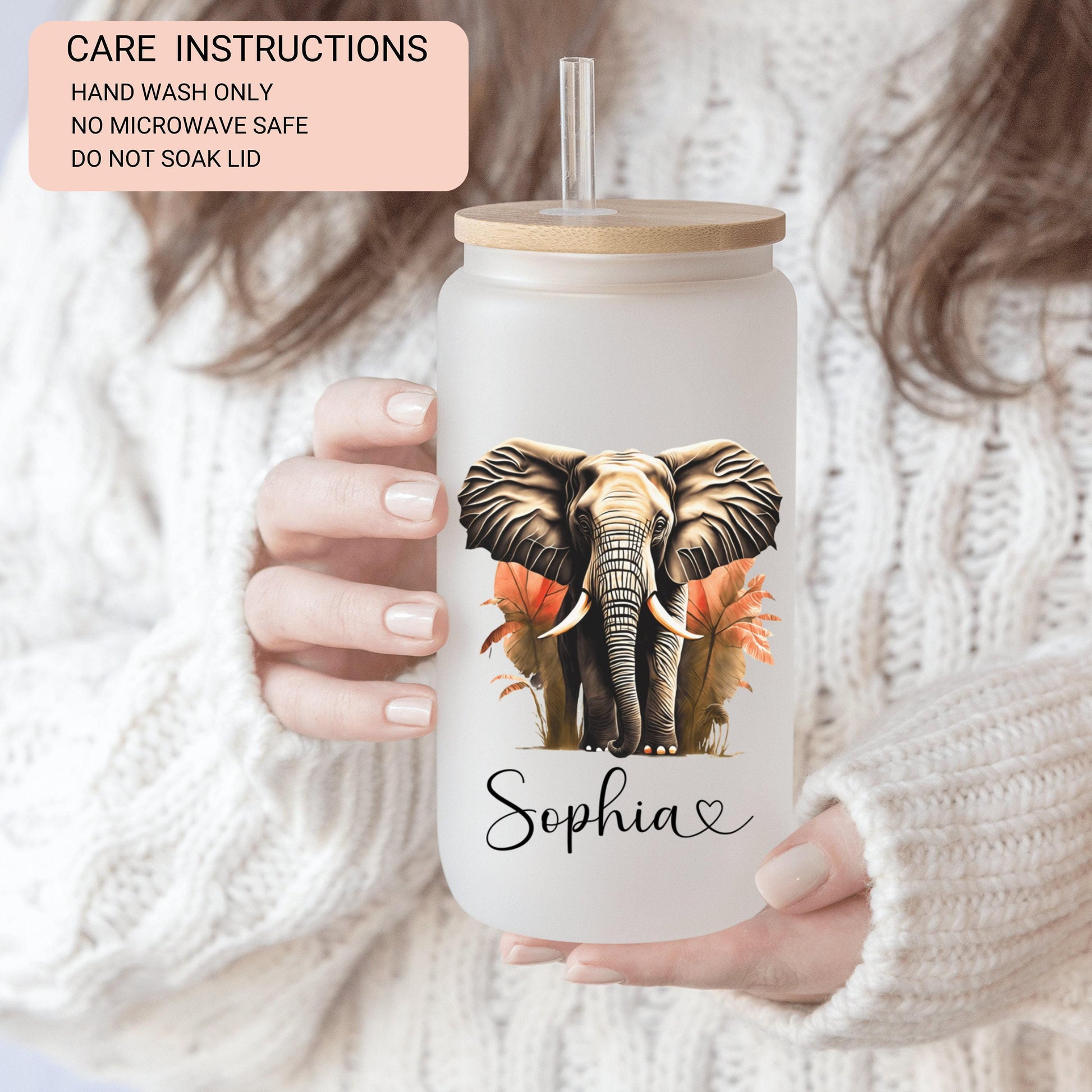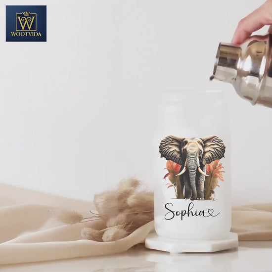 Personalized Elephant Glass Cup - Custom Frosted Iced Coffee Tumbler Gift for Her