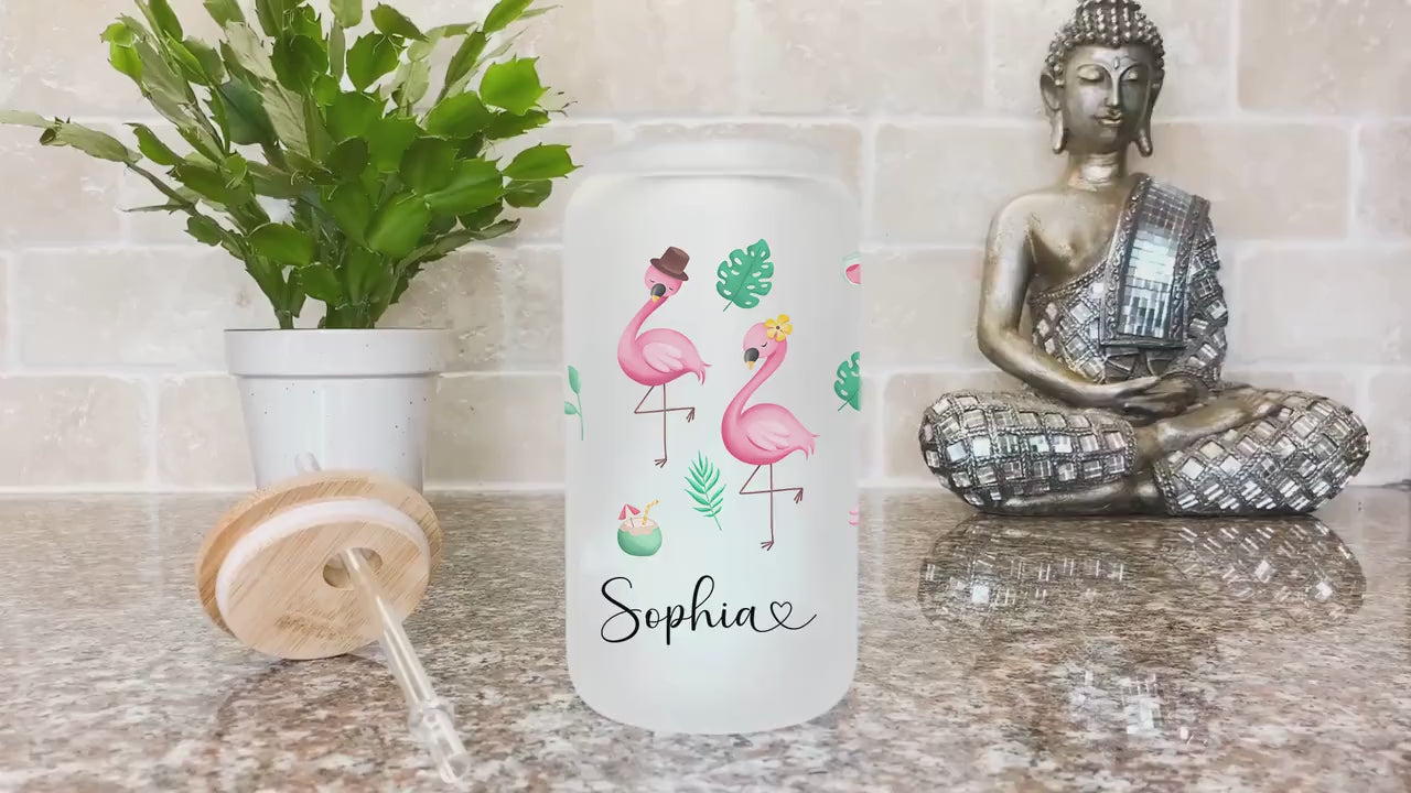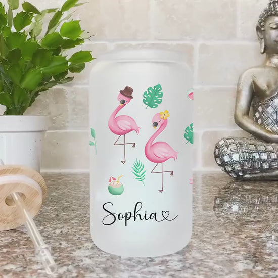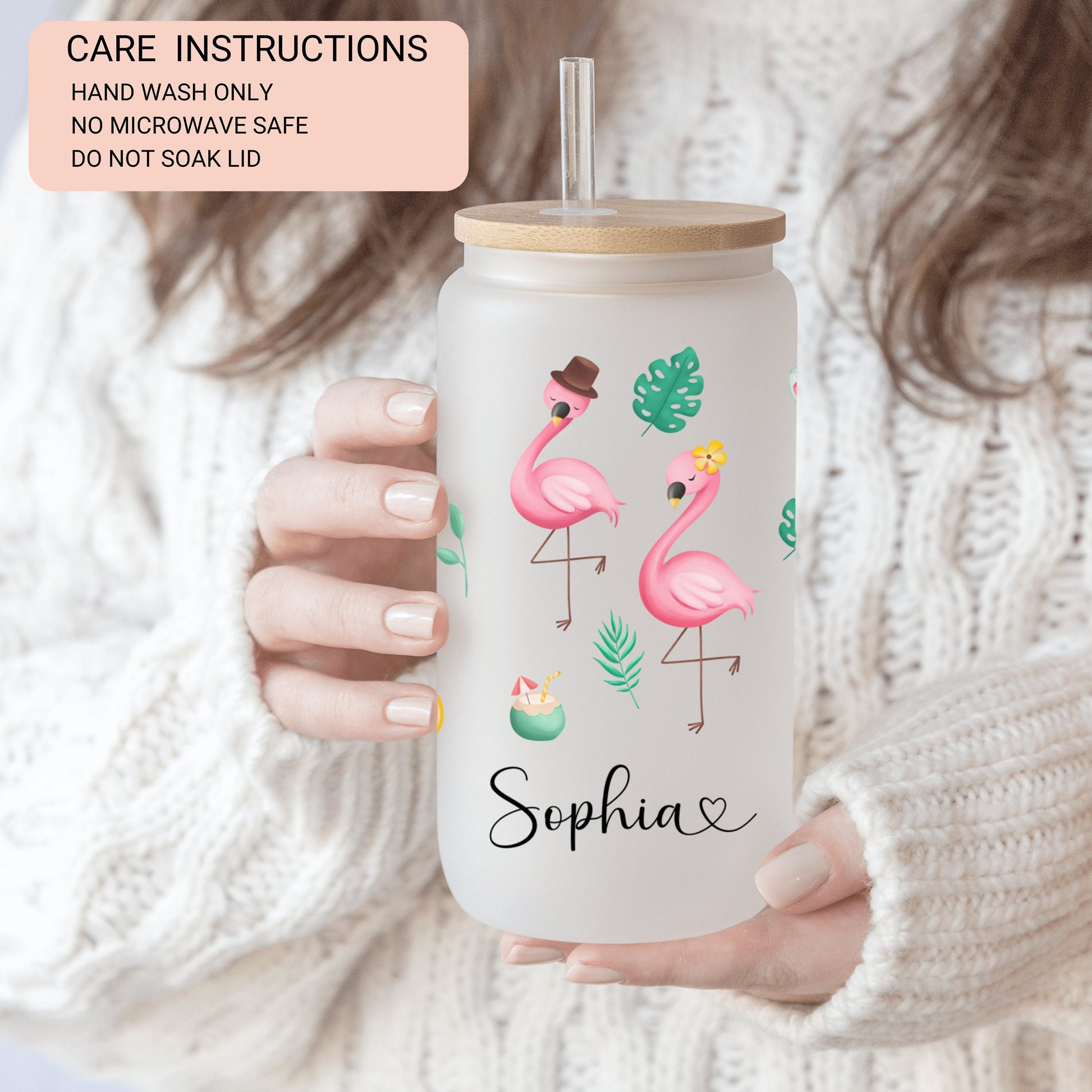 Personalized Flamingo Frosted Glass Tumbler - Custom Iced Coffee Cup