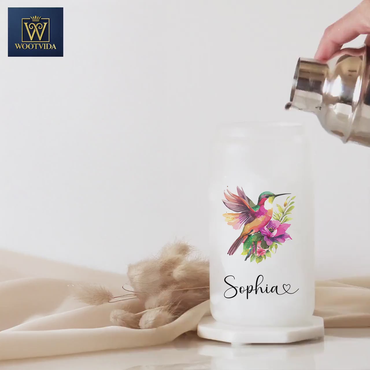 Personalized Hummingbird Frosted Glass Cup - Pink Bird Tumbler Gift for Moms