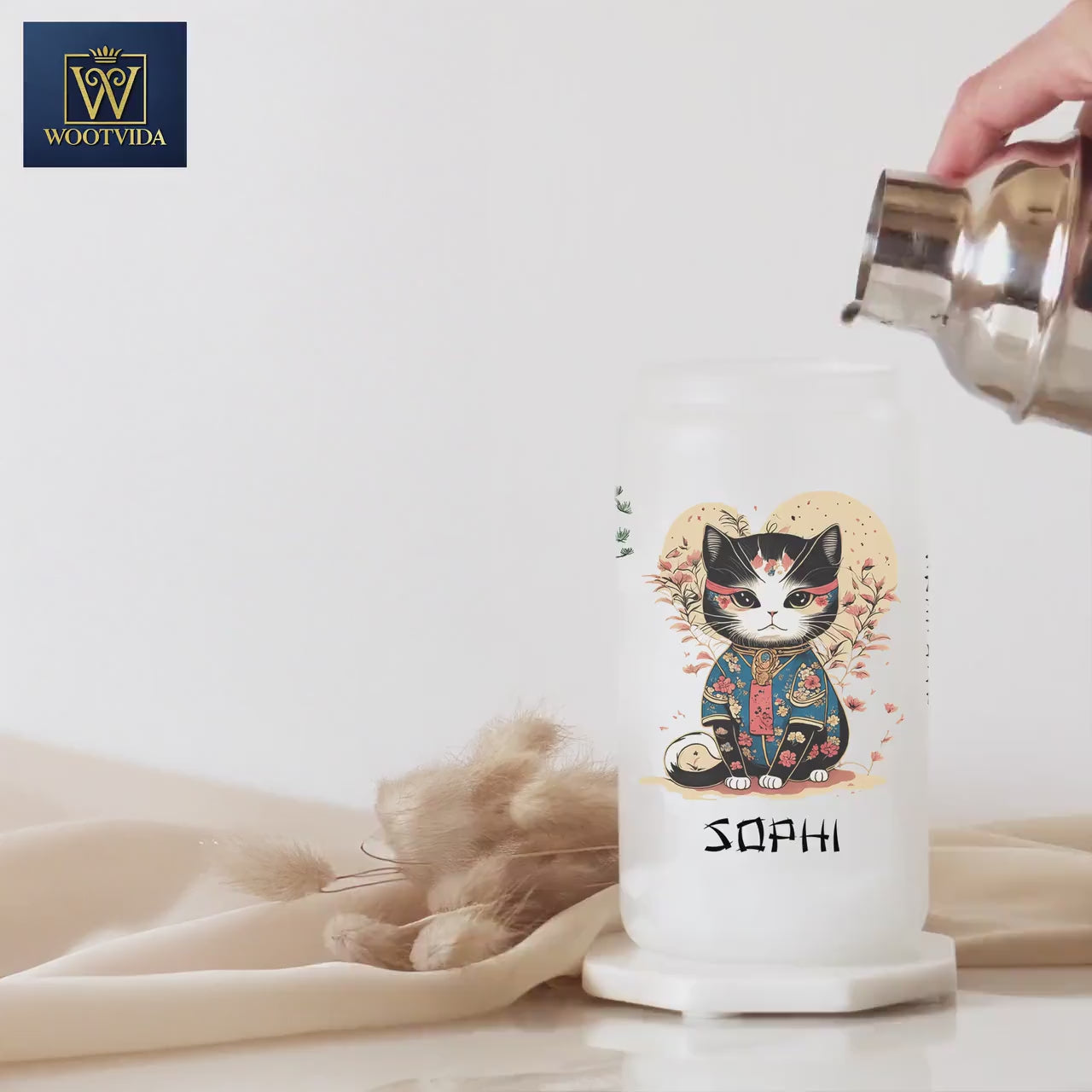 Personalized Japanese Cat Glass Tumbler - Custom Iced Coffee Gift for Cat Lovers