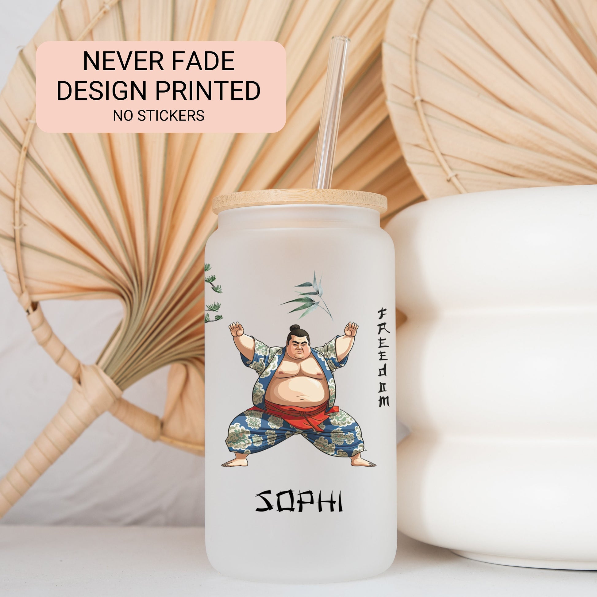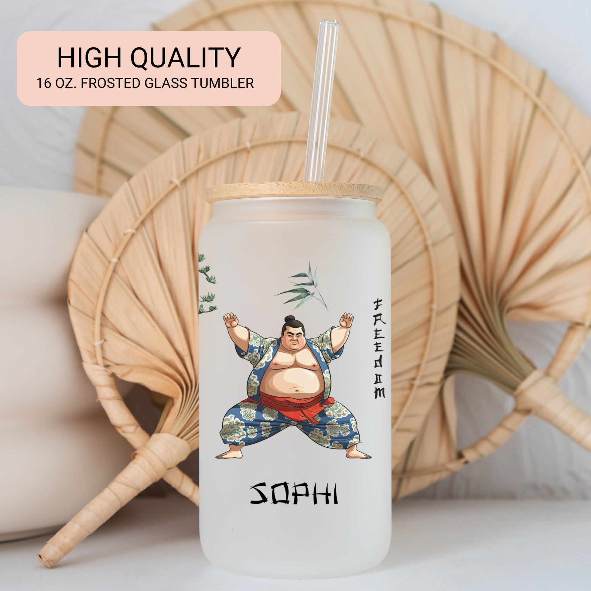 Personalized Japanese Sumo Glass Cup - Custom Iced Coffee Tumbler Gift