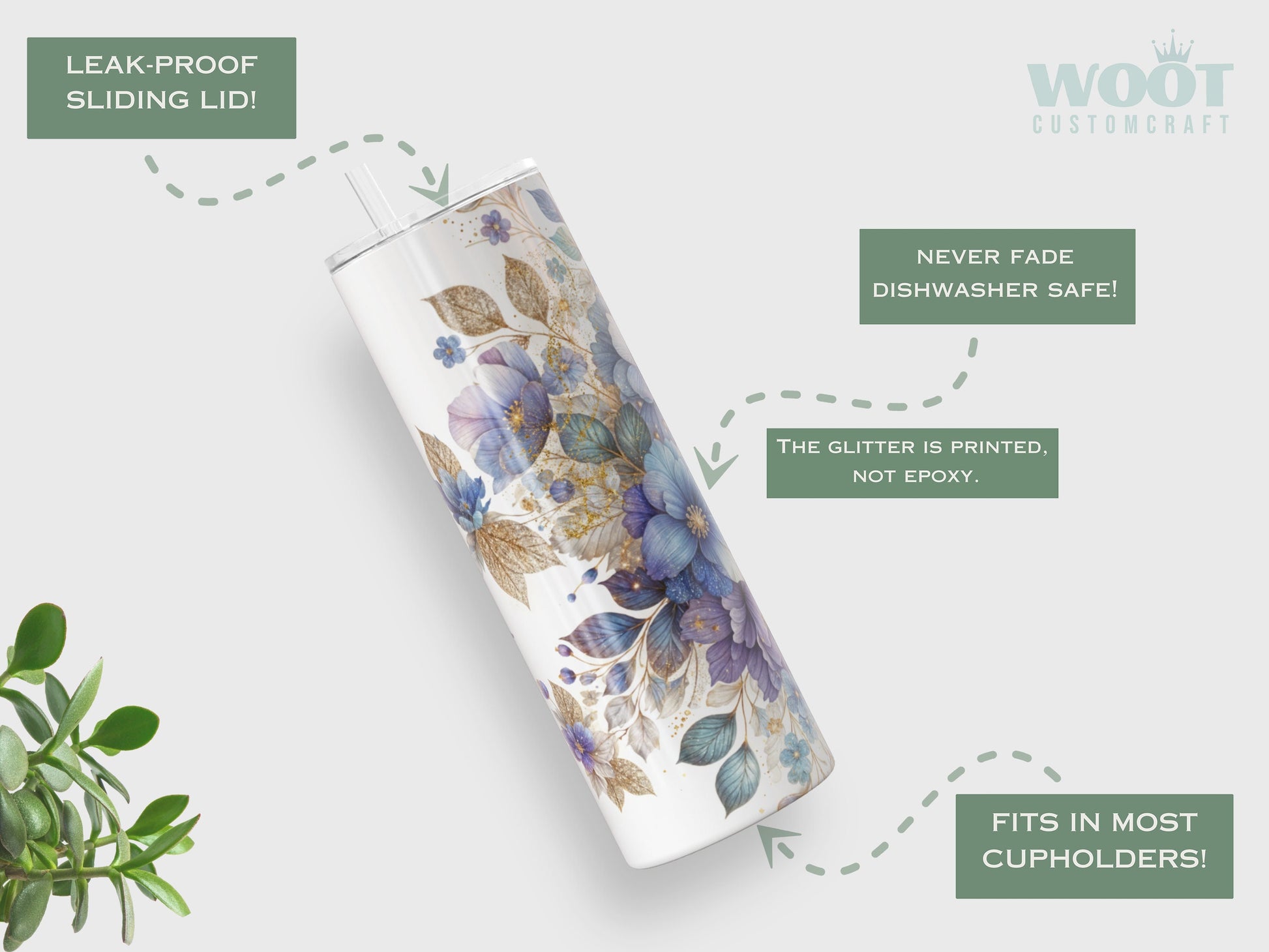 Personalized Purple Floral Glitter Tumbler - Fall Gift for Her or Purple Lovers
