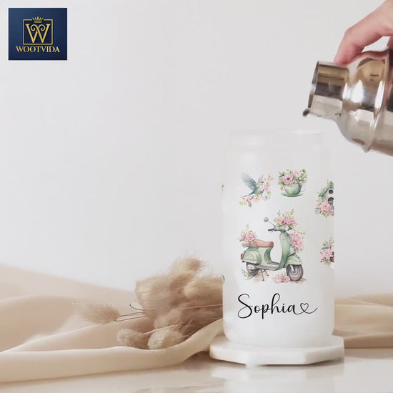 Personalized Romantic Frosted Glass Tumbler - Custom Floral Iced Coffee Cup