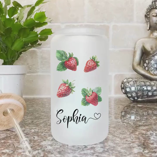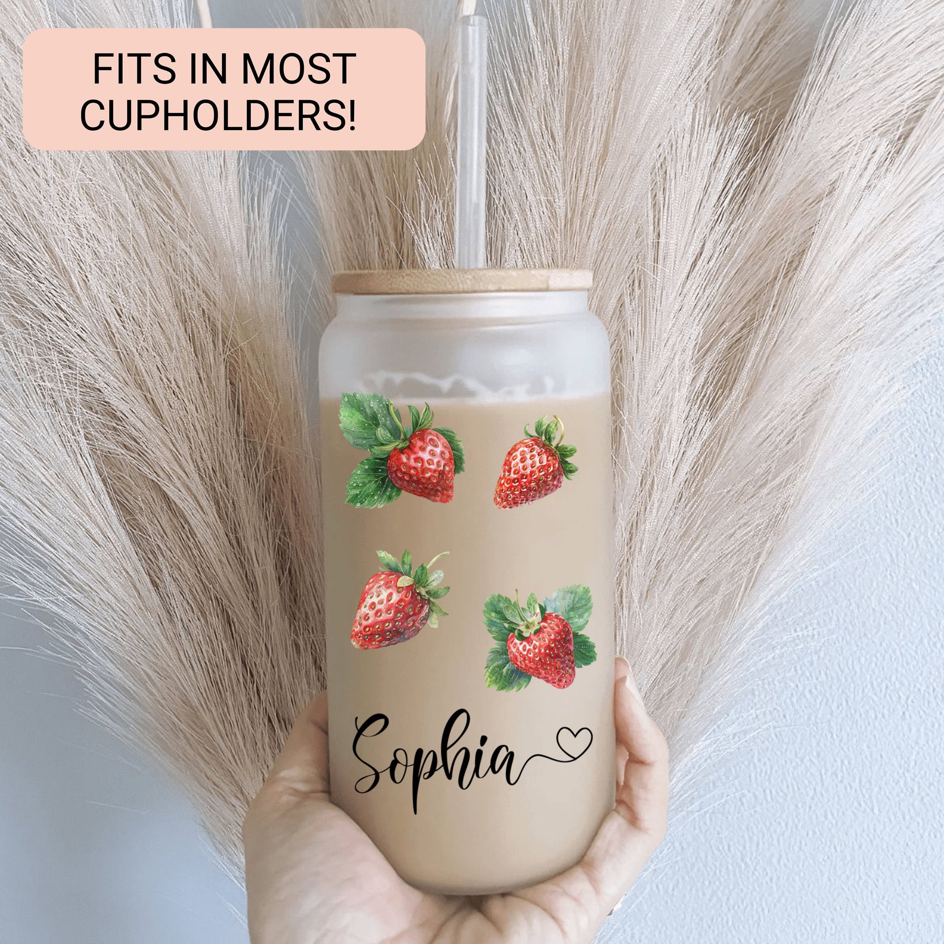Personalized Strawberry Frosted Glass Tumbler - Custom Iced Coffee Cup for Fruit Lovers
